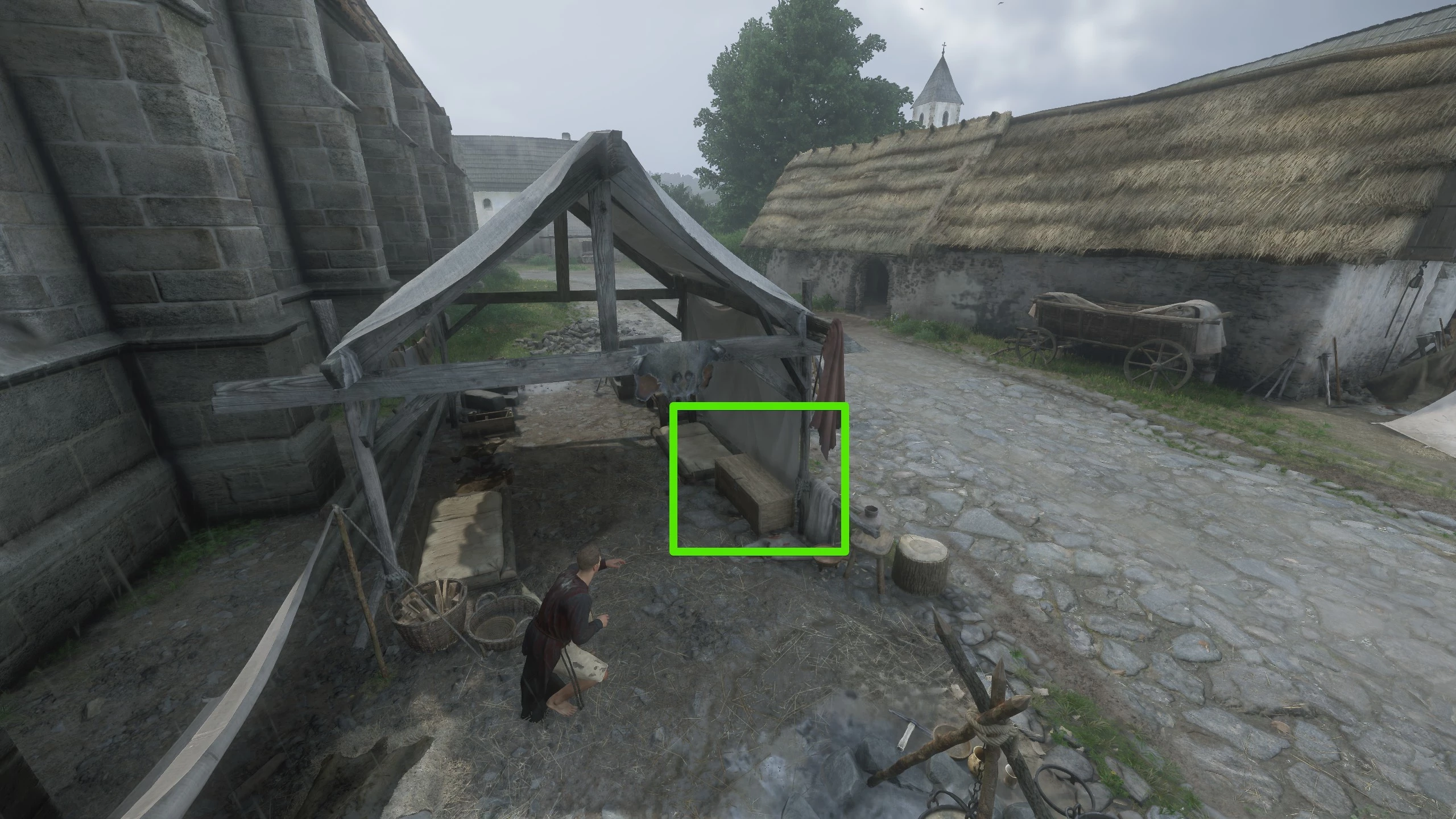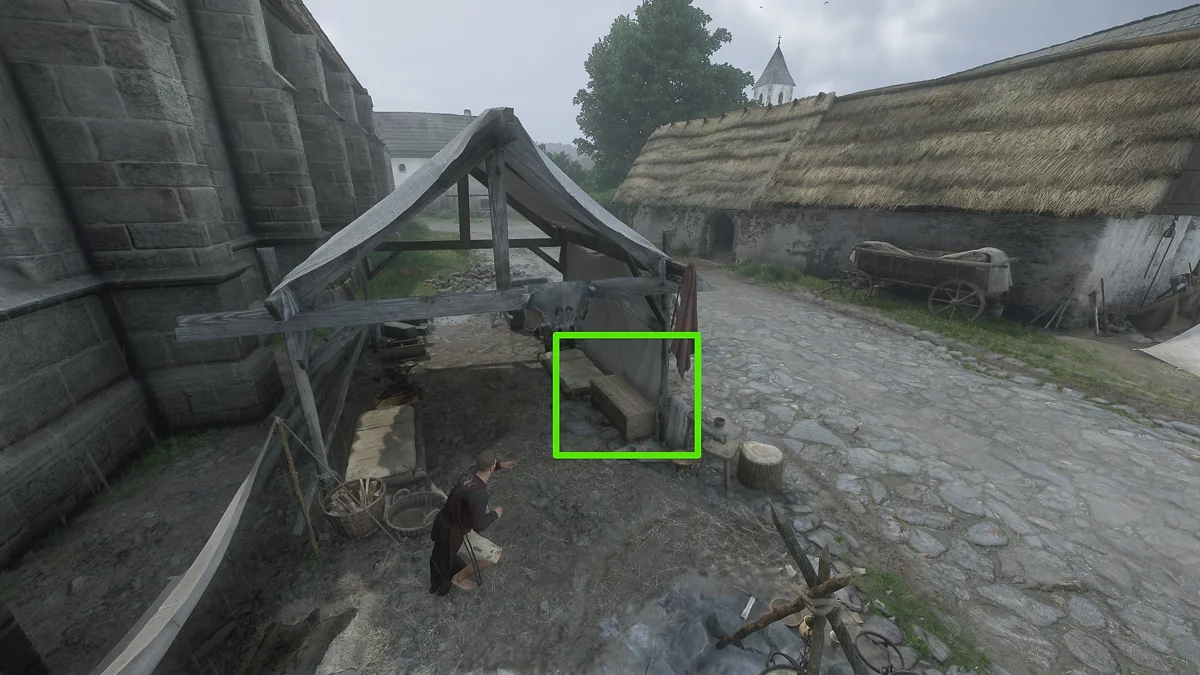 Wyjdź z budynku przez północne drzwi i skręć w lewo. Znajdź biały namiot naprzeciwko farmy, gdzie spotkałeś Zdenka. Otwórz zamek w skrzyni i weź skórę bydlęcą. Teraz udaj się do dowolnego ogrodu i zbierz rumianek, szałwię i walerianę.