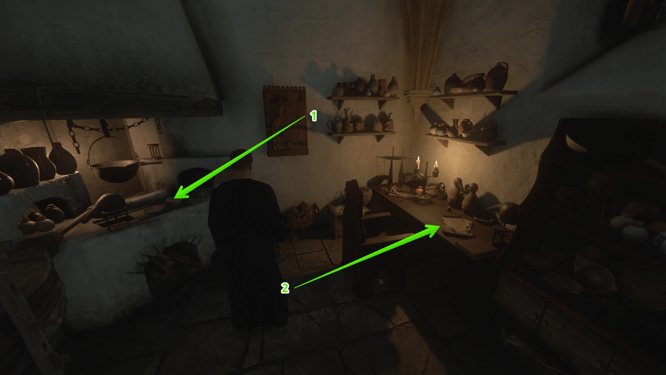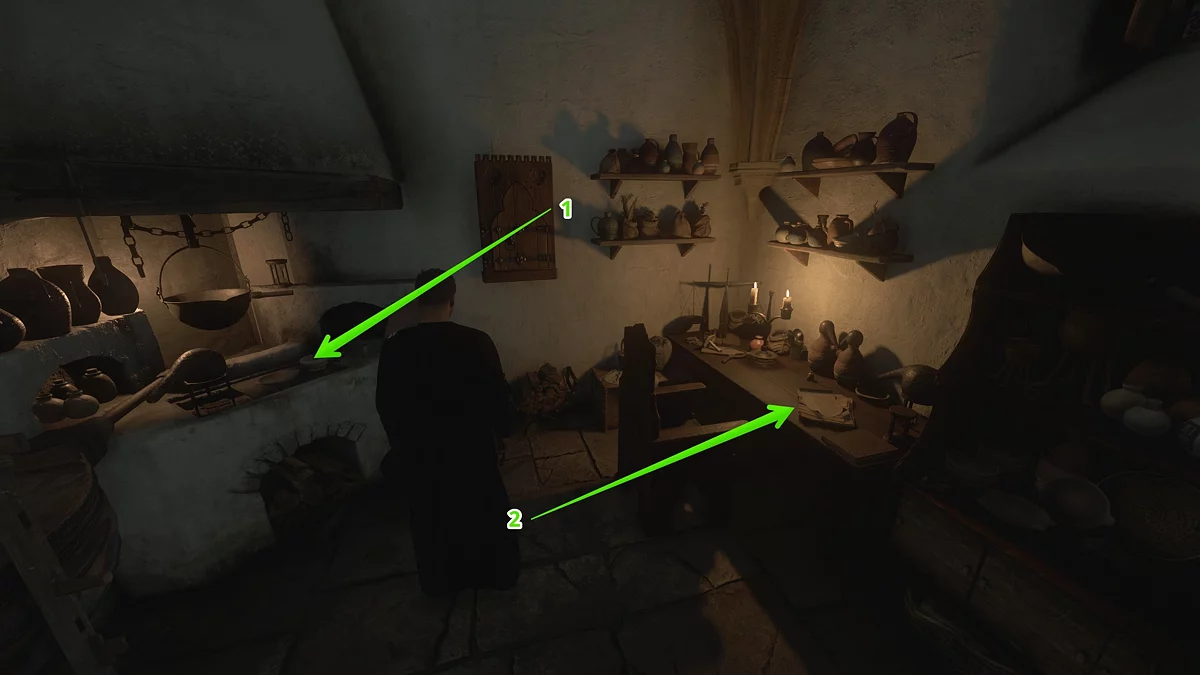 Po scenie przerywnikowej Albicus poprosi Henryka, aby zakradł się do krypty i dowiedział się o źródle choroby. Aby się chronić i uniknąć trwałego debuffu, musisz stworzyć maskę na zarazę. Wybierz najbardziej niepozorny strój, zakradnij się do biblioteki i przejdź trudny test perswazji — brat Crispin powie ci, gdzie znaleźć przepis na olejek aromatyczny. Idź do ostatniego podestu w prawym rogu i znajdź stronę z przepisem na Olej Ochronny przed Chorobami.
