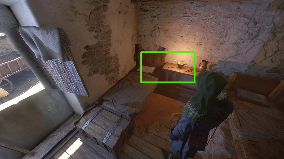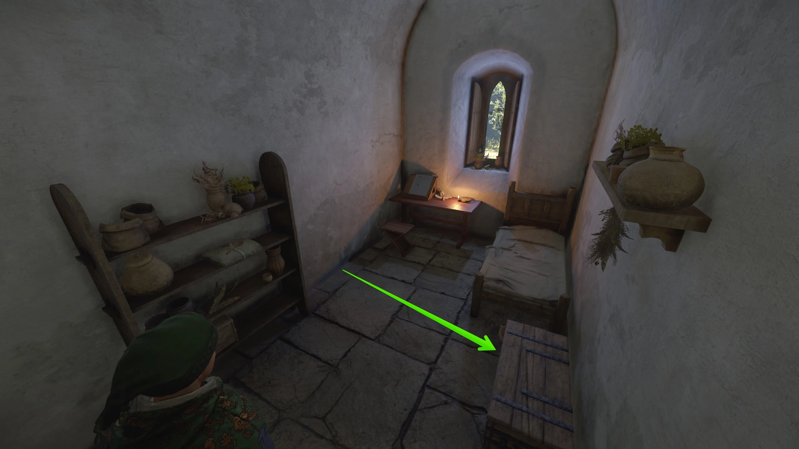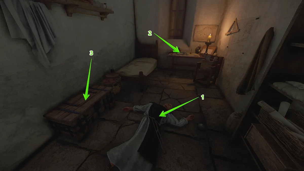 Wróć na powierzchnię i wejdź w drugie drzwi po prawej w rzędzie mieszkalnym. Tam znajdziesz martwego mnicha. Zbadaj ciało i biurko, a następnie otwórz skrzynię, w której znajdziesz notatki od Petra Parléřa.