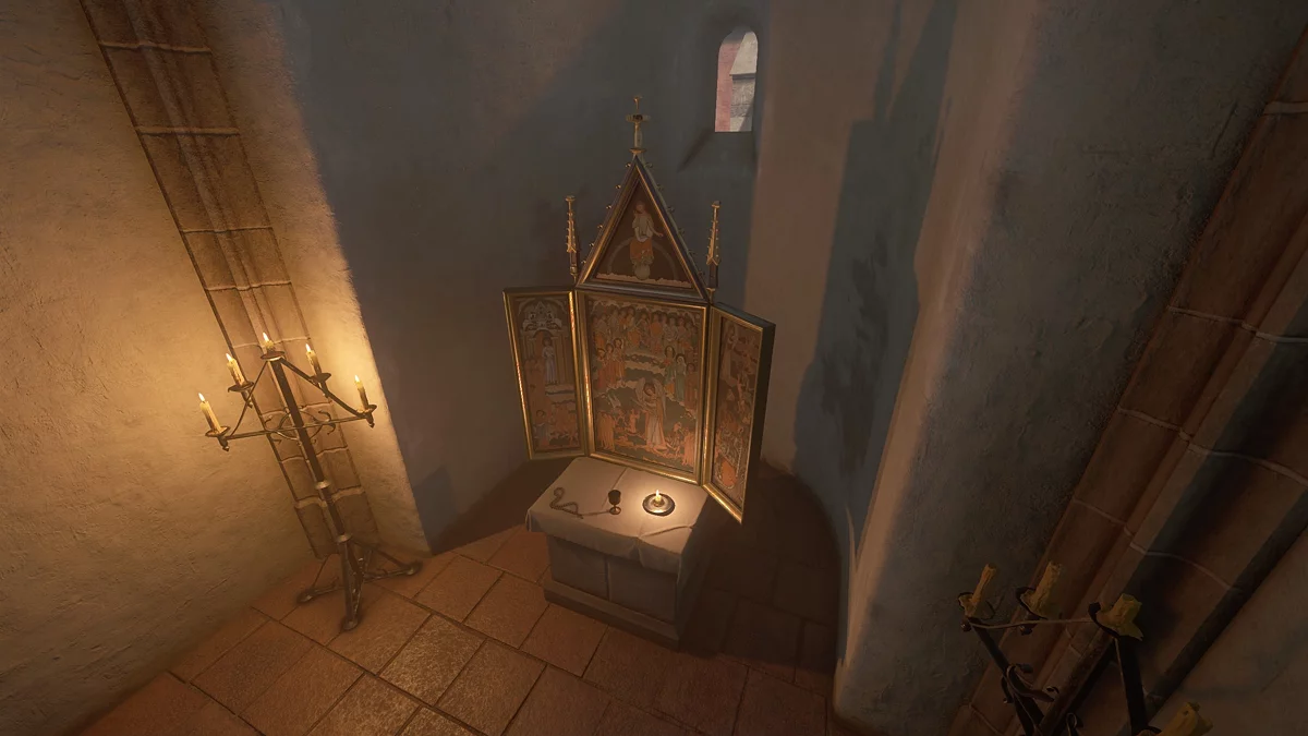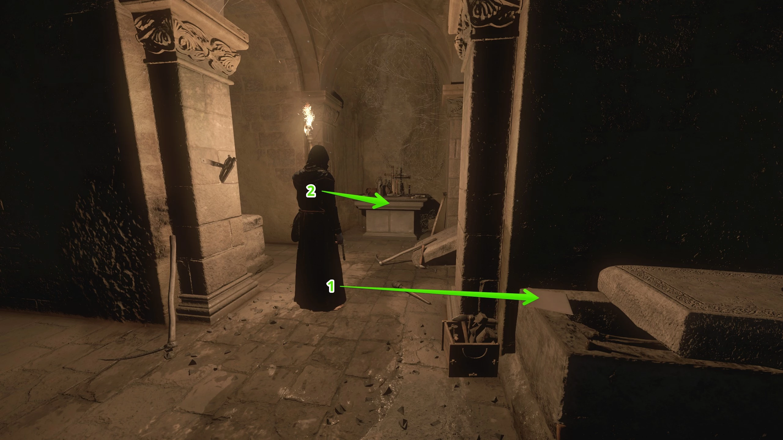 Podejdź do ściany po lewej stronie ołtarza i zdemontuj ją. Opuszczaj kryptę niezauważony i wróć do Albicusa w splądrowanym pomieszczeniu. Następnie musisz dowiedzieć się, kto próbował dokonać rabunku. Zbadaj porozrzucane przedmioty w lewym rogu i sprawdź zamek w drzwiach.