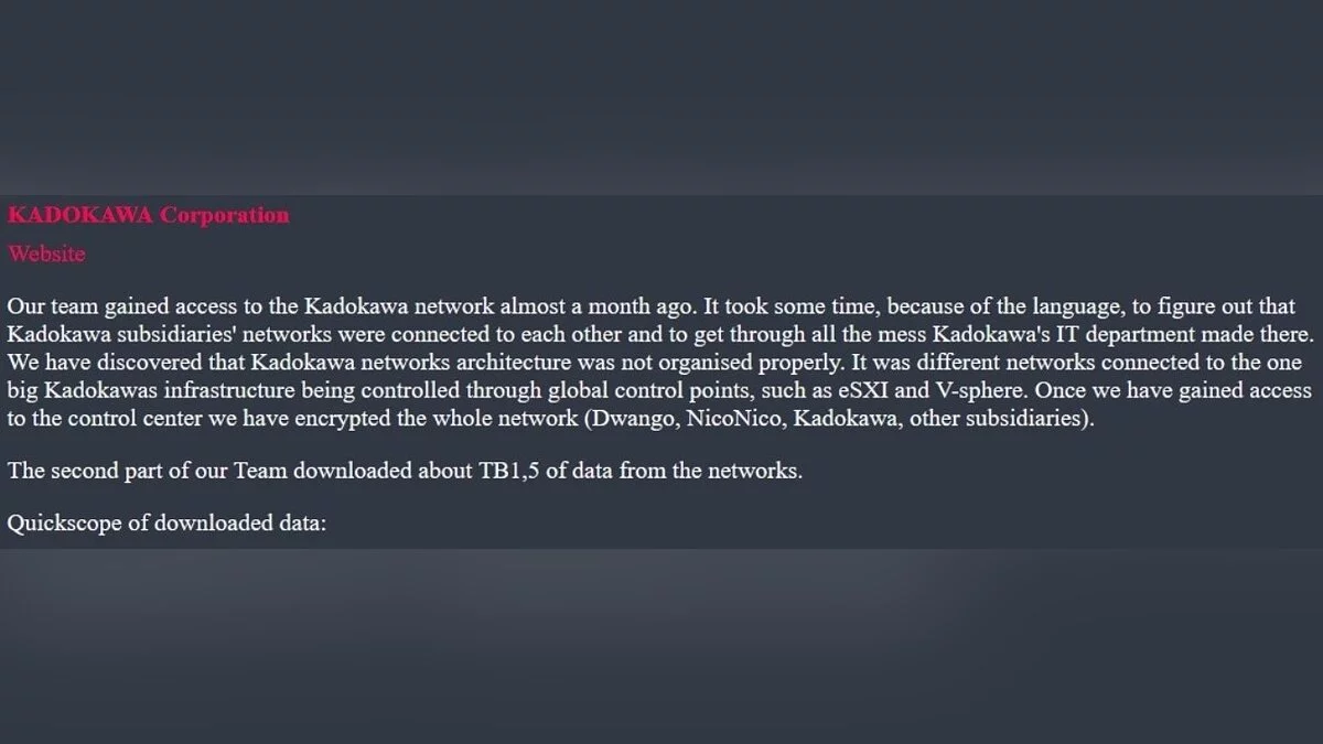 It is known that the hacker group Black Suit is behind the attack. They reported the breach of Kadokawa Group's internal network. Approximately 1.5 TB of data was stolen, which reportedly includes various documents, business plans, financial records, and personal information about employees.