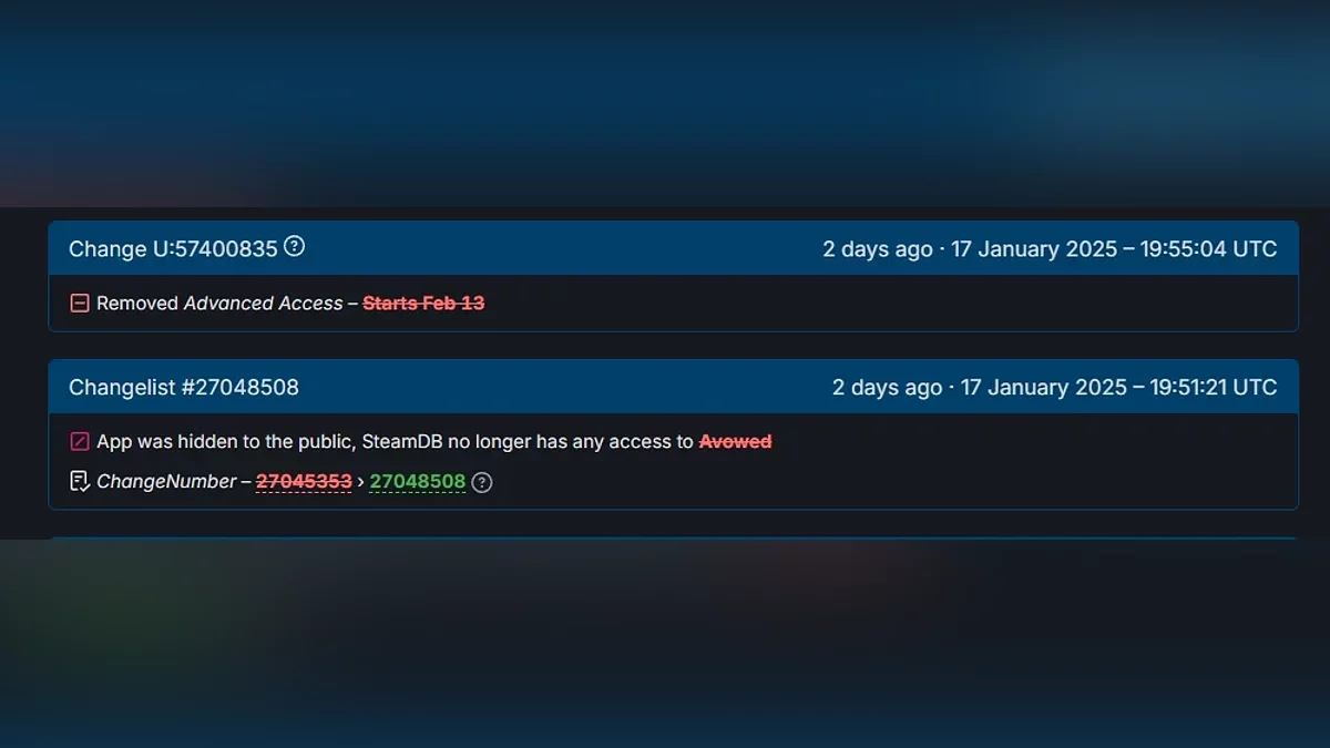 Kilku użytkowników na Reddit zgłosiło, że gra zniknęła z ich listy na Steamie po złożeniu zamówienia przedpremierowego. Dodatkowo, Centrum Społeczności Avowed zostało wyłączone z nieznanego powodu. Potwierdzenie tego można znaleźć w SteamDB — serwis pokazuje, że zmiany miały miejsce kilka dni temu. Linia o wydaniu w wersji wczesnego dostępu 13 lutego również została usunięta.