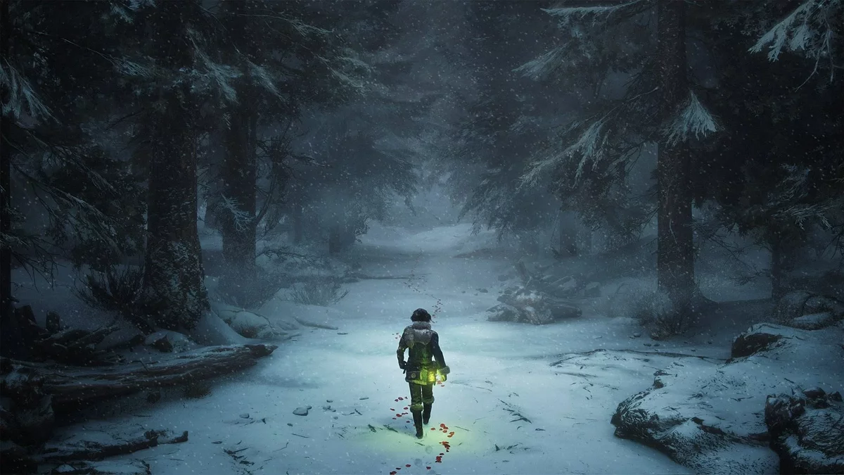 Zrzut ekranu przedstawia zimowy las, w którym protagonista podąża ścieżką z płatków róż. Overture będzie prequelem Lies of P i zbada wydarzenia, które miały miejsce przed powstaniem marionetek i upadkiem Krat.