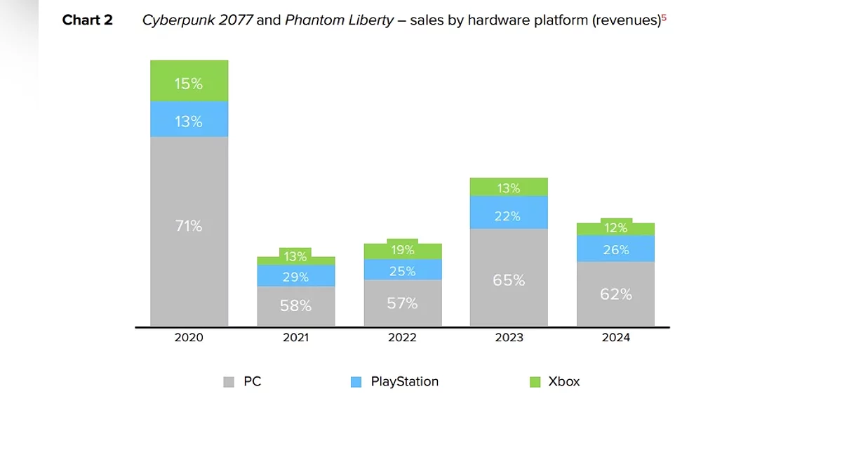 Ostatnie dwie prezentacje przedstawiają podobne dane dla Cyberpunka 2077 oraz jego rozszerzenia Phantom Liberty. Liczby opowiadają inną historię—sprzedaż cyfrowa niemal całkowicie zlikwidowała wersje fizyczne, a sprzedaż na PC znacząco przewyższa sprzedaż na konsolach.