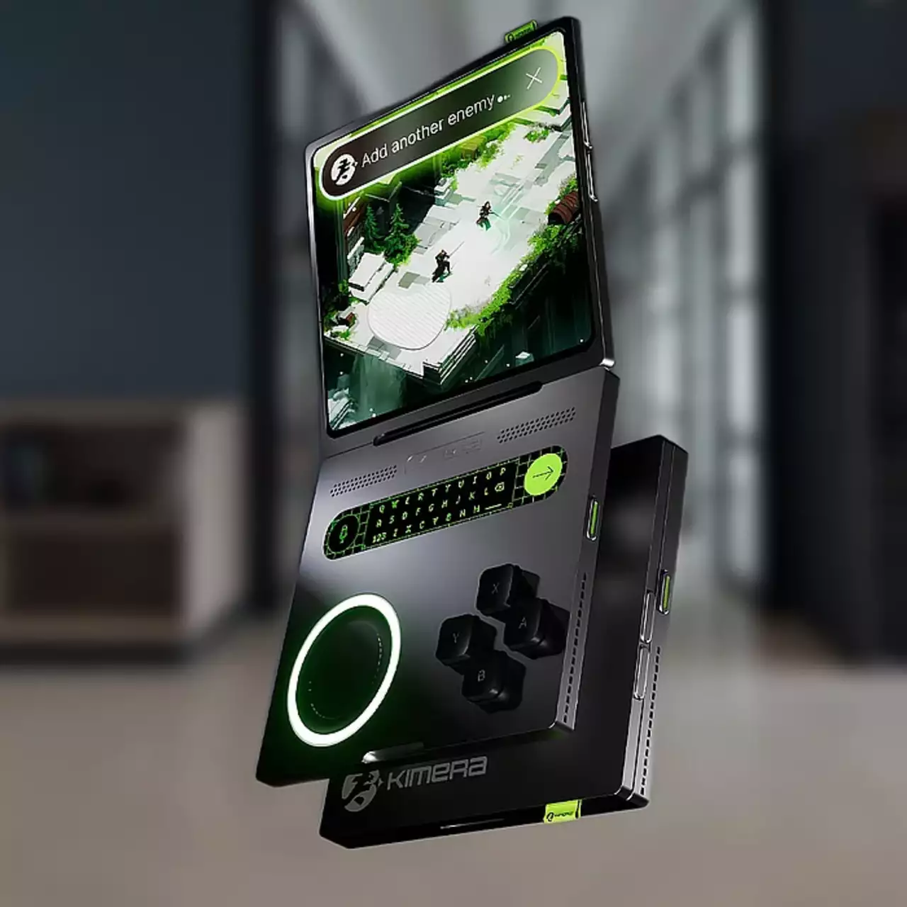 Projekt jest równie unikalny. Składa się jak clamshell: górna część ma ekran OLED, podczas gdy dolna to powierzchnia wrażliwa na dotyk, która pełni funkcję klawiatury lub interfejsu sterującego. Po bokach znajdziesz mikrofony, D-pad, touchpad oraz tylne przyciski z rowkami na palce dla dodatkowego komfortu. Jest również lekki — waży tylko 450 gramów i ma zaledwie 10 mm grubości, co ułatwia noszenie. Mówi się, że bateria wystarcza na 10 godzin na jednym ładowaniu.