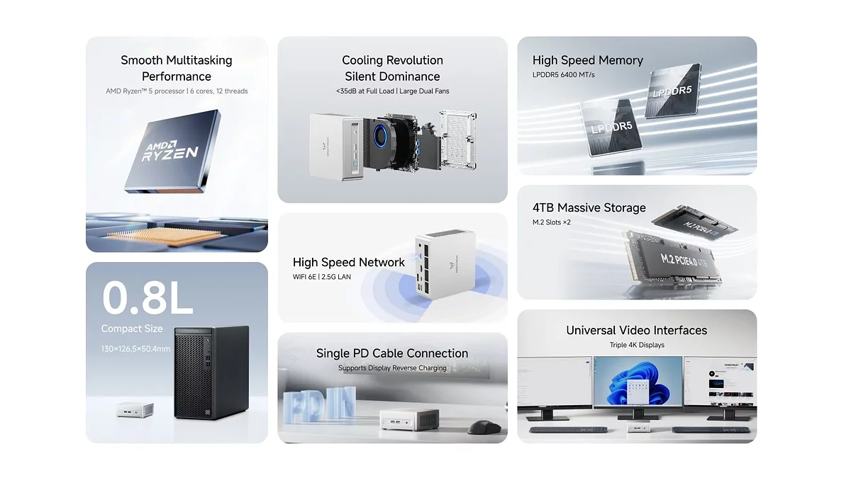 Opcje łączności są liczne: panel przedni zawiera dwa porty USB 3.2 Gen 2 Type-A, podczas gdy z tyłu znajdują się HDMI 2.1, DisplayPort 1.4, port USB4 o prędkości 40 Gbps z zasilaniem do 100W, dwa porty USB 2.0, gniazdo audio oraz port Ethernet 2.5G. Łączność bezprzewodowa obsługiwana jest przez Wi-Fi 6E i Bluetooth 5.3, zapewniając stabilne osiągi. Mini PC obsługuje jednocześnie do trzech zewnętrznych wyświetlaczy — w rozdzielczości 8K przy 60Hz lub 4K przy 120Hz.