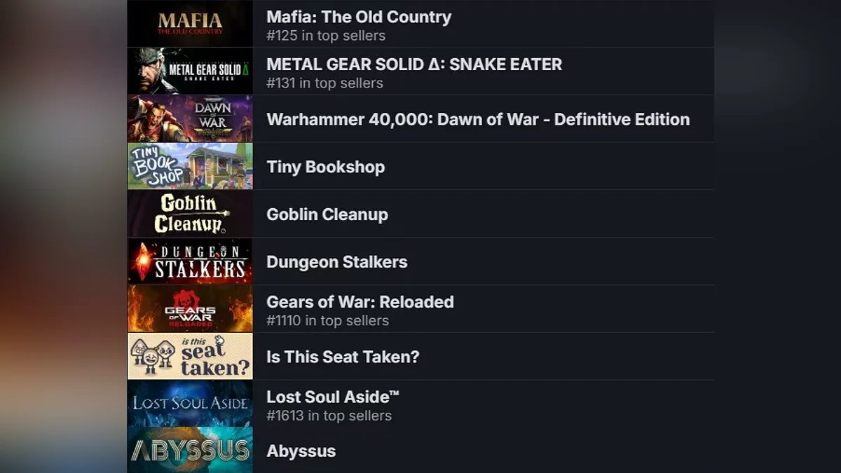 Na pierwszym miejscu znajduje się gra akcji z fabułą Mafia: The Old Country, która będzie pierwszą częścią serii bez otwartego świata. Na drugim miejscu mamy tytuł akcji skradankowej Metal Gear Solid Delta: Snake Eater, remake ikonicznego Metal Gear Solid 3: Snake Eater zbudowanego na silniku Unreal Engine 5. Na trzecim miejscu znajduje się gra strategiczna Warhammer 40,000: Dawn of War – Definitive Edition, remaster klasyka z 2004 roku.