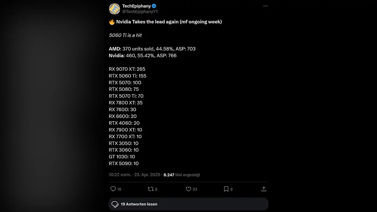 W ciągu siedmiu dni sprzedano 460 procesorów graficznych NVIDIA w porównaniu do 370 AMD. Najlepiej sprzedającym się modelem był Radeon RX 9070 XT z 265 sprzedanymi sztukami, ale następne cztery miejsca były całkowicie zdominowane przez karty NVIDIA: RTX 5060 Ti (155 sztuk), RTX 5070 (100 sztuk), RTX 5080 (75 sztuk) i RTX 5070 Ti (70 sztuk). Co ciekawe, nawet starszy model GT 1030 znalazł nabywców — rzadki widok na dzisiejszym rynku GPU.