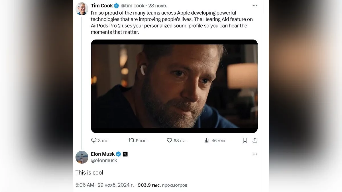 «To jest świetne», — skomentował tę funkcję znany miliarder. Napisał to w komentarzu pod postem dyrektora generalnego Apple, Tima Cooka, który stwierdził, że jest dumny z zespołu deweloperów zaangażowanych w wdrożenie funkcji aparatu słuchowego dla AirPods Pro 2.