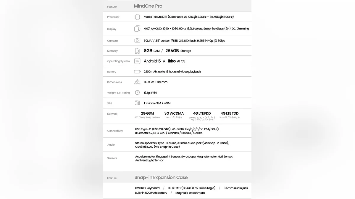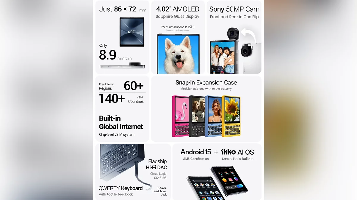 Kampania crowdfundingowa na nietypowy smartfon iKKO MindOne zakończyła się sukcesem na Kickstarterze. Urządzenie zebrało ponad 1,2 miliona dolarów — przewyższając początkowe cele jego twórców. Główna idea? Kompaktowy gadżet wypełniony premium funkcjami. Mając zaledwie 86×72×8,9 mm, posiada 4,02-calowy wyświetlacz AMOLED chroniony ultra-twardym, odpornym na zarysowania szkłem szafirowym.