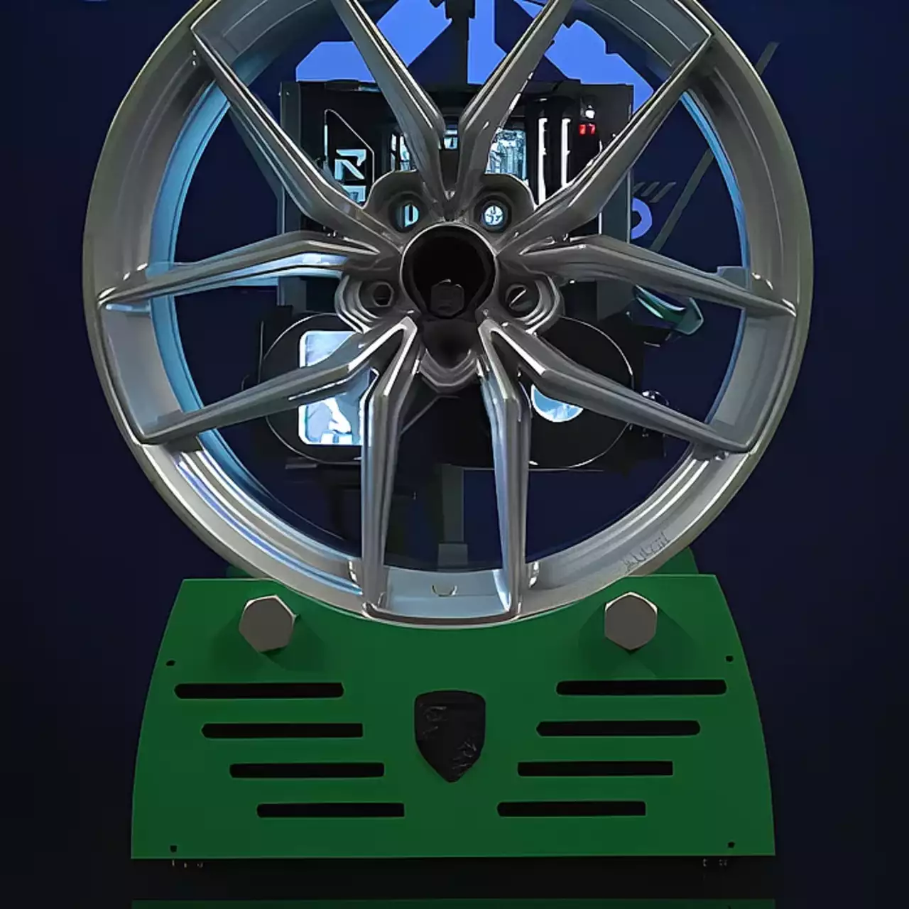 NVIDIA, we współpracy z modderem JCustom, zaprezentowało unikalny projekt: w pełni funkcjonalny komputer do gier zbudowany wewnątrz koła Porsche 911 Turbo S. Budowa wykorzystuje felgę HRE FF21 jako podstawę, a umieszczenie komponentów o wysokiej wydajności w ograniczonej przestrzeni koła stanowiło znaczące wyzwanie. Aby to rozwiązać, zaprojektowano niestandardową tacę na płytę główną, która jest zamontowana bezpośrednio do felgi, tworząc iluzję, że kluczowe komponenty unoszą się w powietrzu za szprychami.