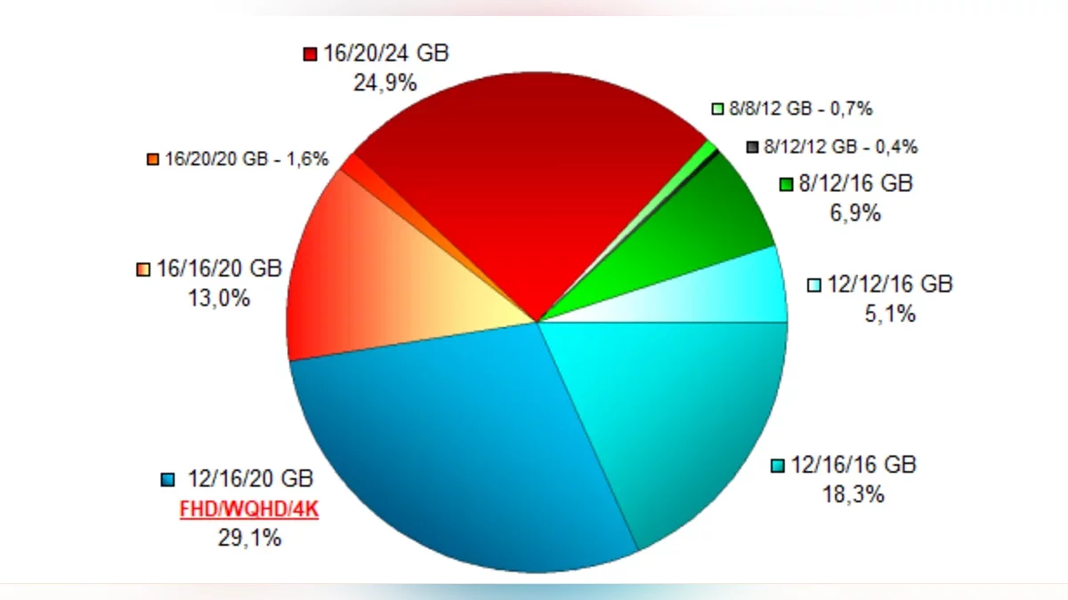 W segmencie Quad HD (1440p) bezsprzecznym liderem jest 16 GB, z 60% głosów. Jedna czwarta respondentów uważa nawet, że dla przyszłości kupujący powinni rozważyć 20 GB. Co ciekawe, opinie są bardziej podzielone w segmencie 4K, gdzie nie ma jednego faworyta. Karty z 20 GB otrzymały 43.7% głosów, konfiguracje 16 GB wybrało 30.3%, a niemal jedna czwarta uczestników (24.9%) stwierdziła, że dla ultra-wysokich rozdzielczości i maksymalnych ustawień 24 GB jest już konieczne.