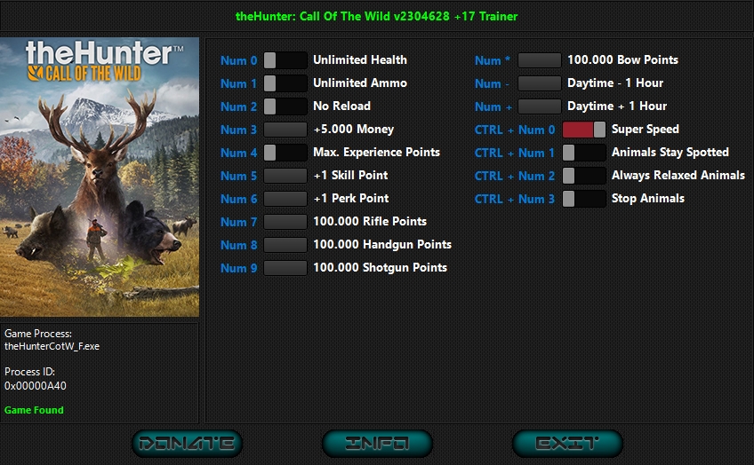С официальной версией игры 2249344 — работает. Пользовалась только "Ctrl + Num 2: Животные всегда спокойны". Остальное не проверяла, без надобности. Сначала антивирус ругался, после помещения файла в карантин, перестал. Озвучка приветствия и прощания, ну такая, на любителя))