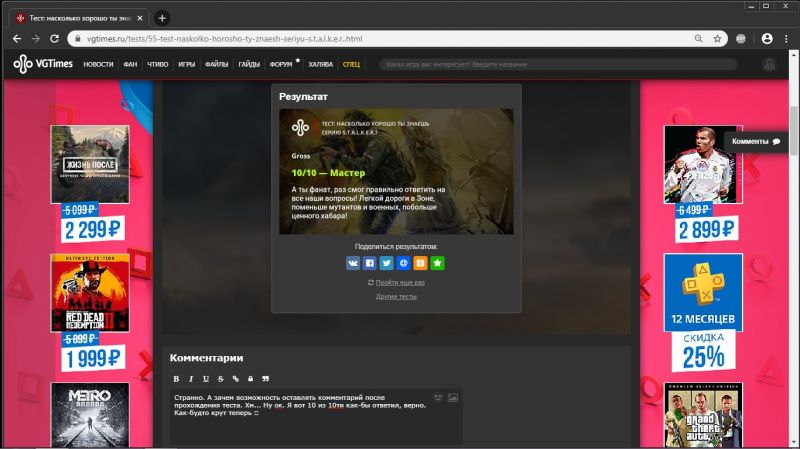 Странно. А зачем возможность оставлять комментарий после прохождения теста. Хм... Ну ок. Я вот 10 из 10ти как-бы ответил, верно. Как-будто крут теперь